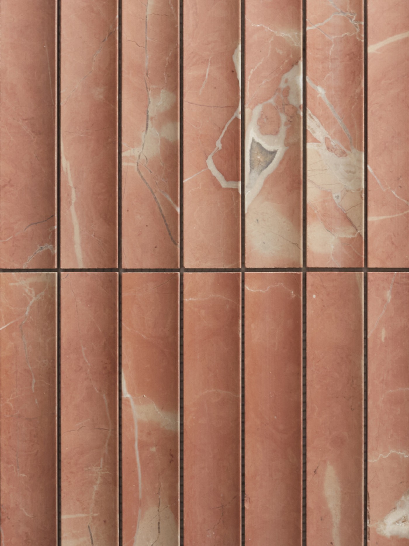 etui is a sculpted fluted stone that creates an undulating surface both subtle and classic. with a long tradition of architectural ornamentation, rojo alicante is an earthy, bold rusty-red marble with scattered white and grey veining.