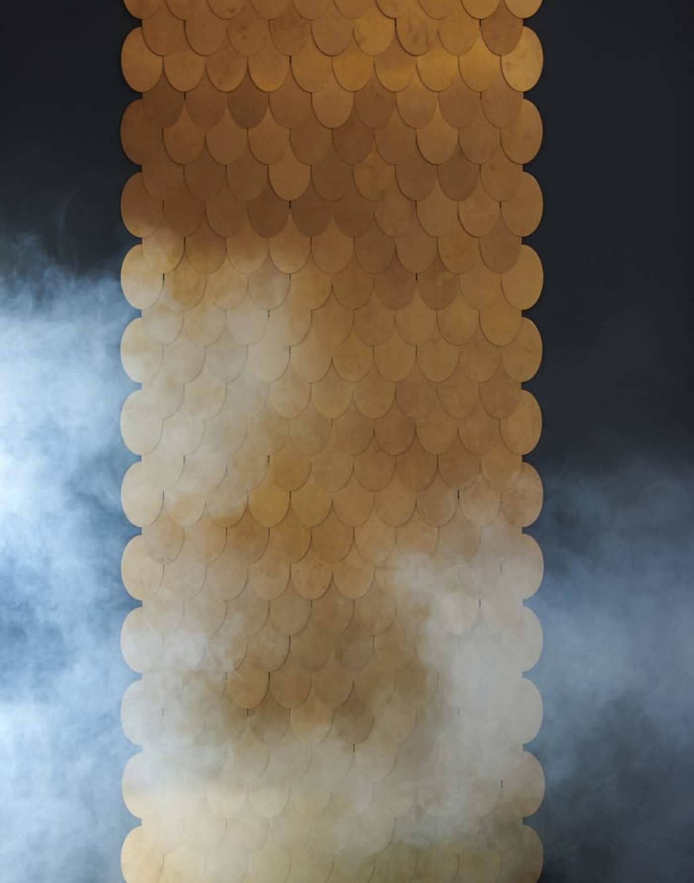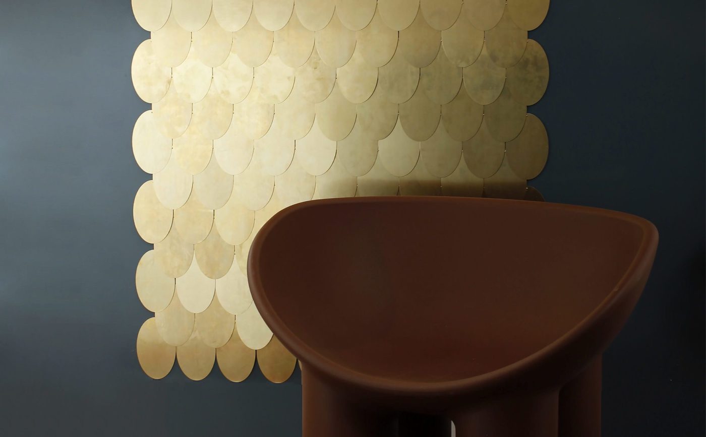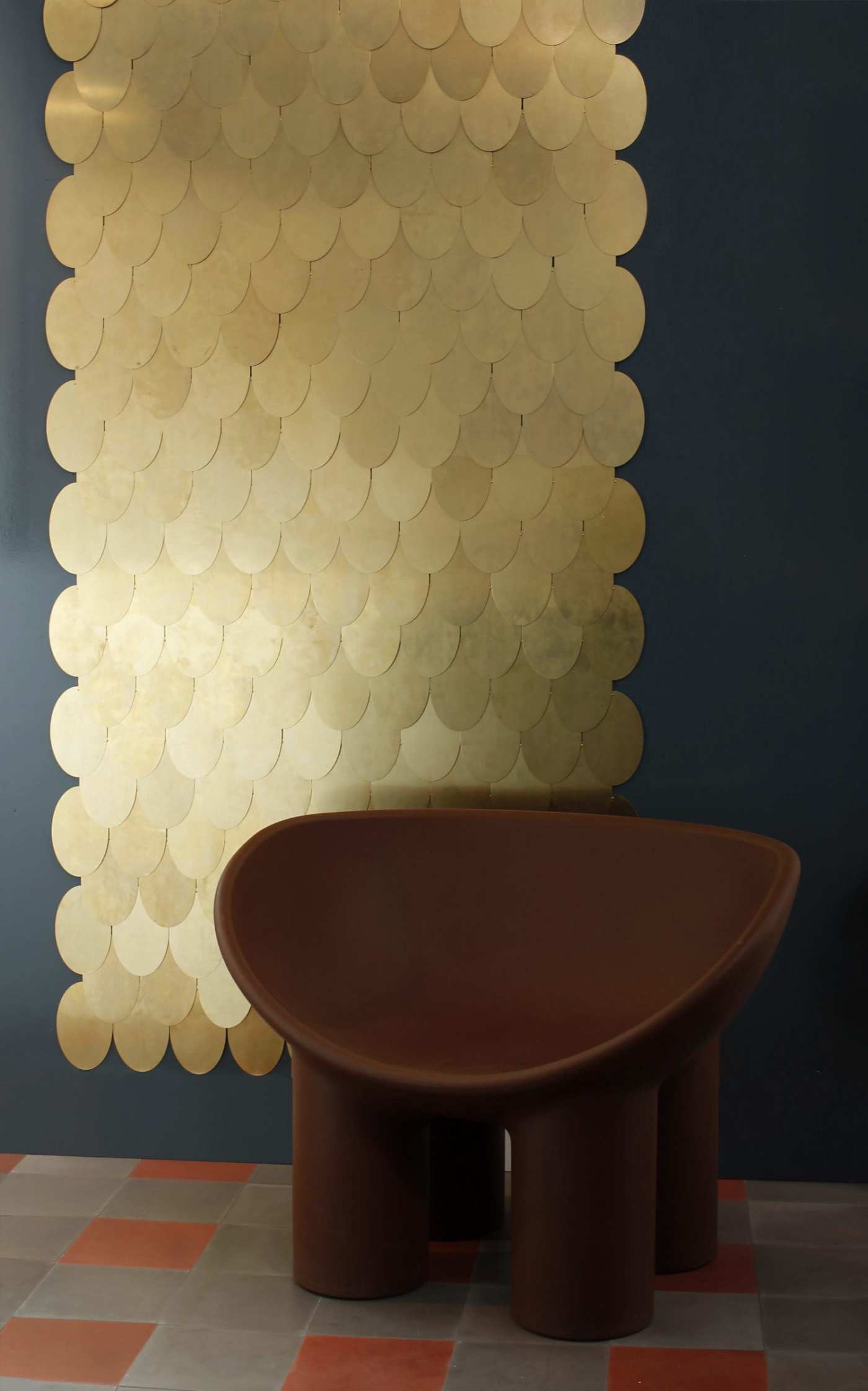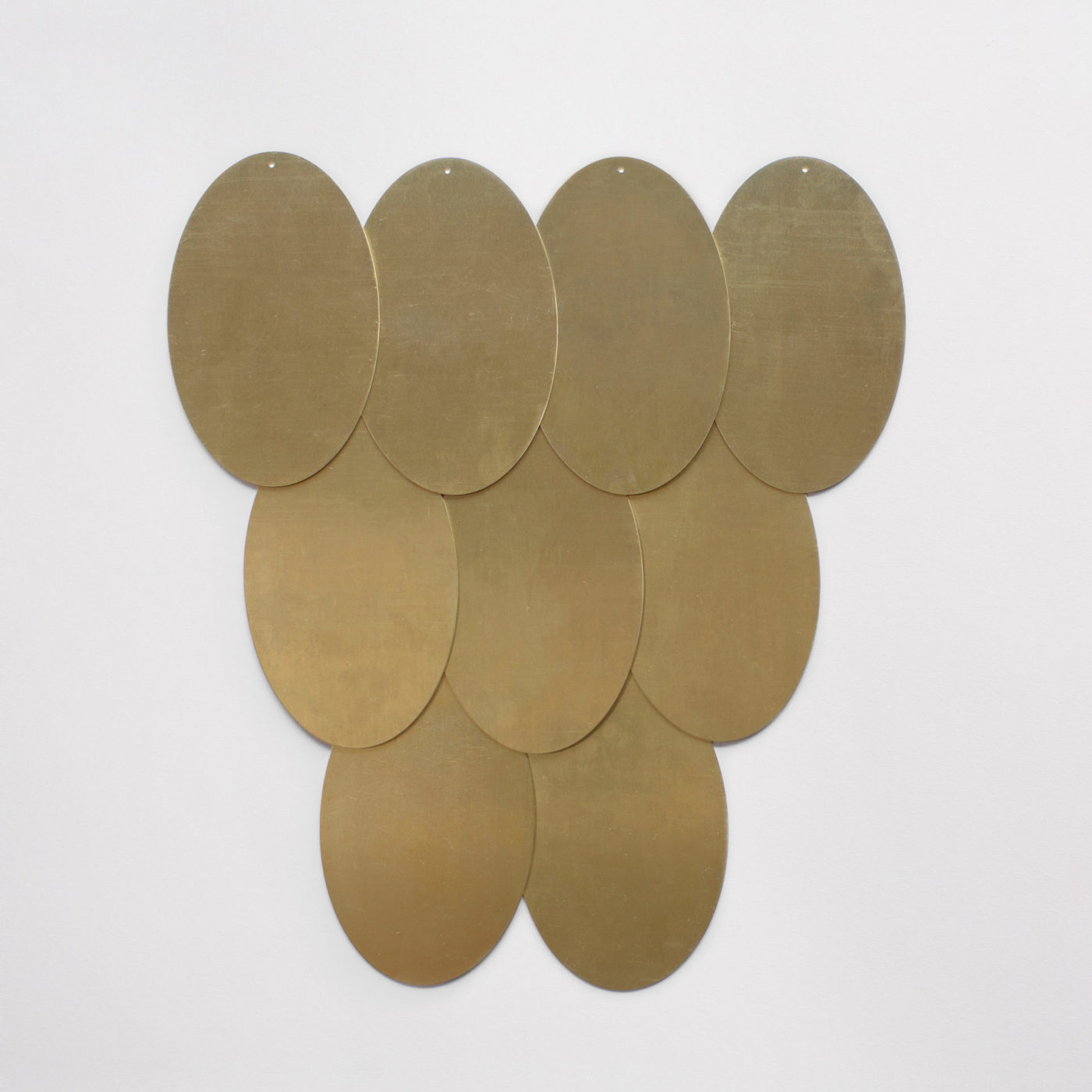 individual sequins are secured to the wall using ¾” brass pins and spacers that set the sequins ⅛” from the wall. each order includes installation instructions for laying out a grid on your wall to create an overlapping pattern reminiscent of fish scales. we also provide the ¾” brass escutcheon pins and ⅛” brass spacers required for the installation as well.