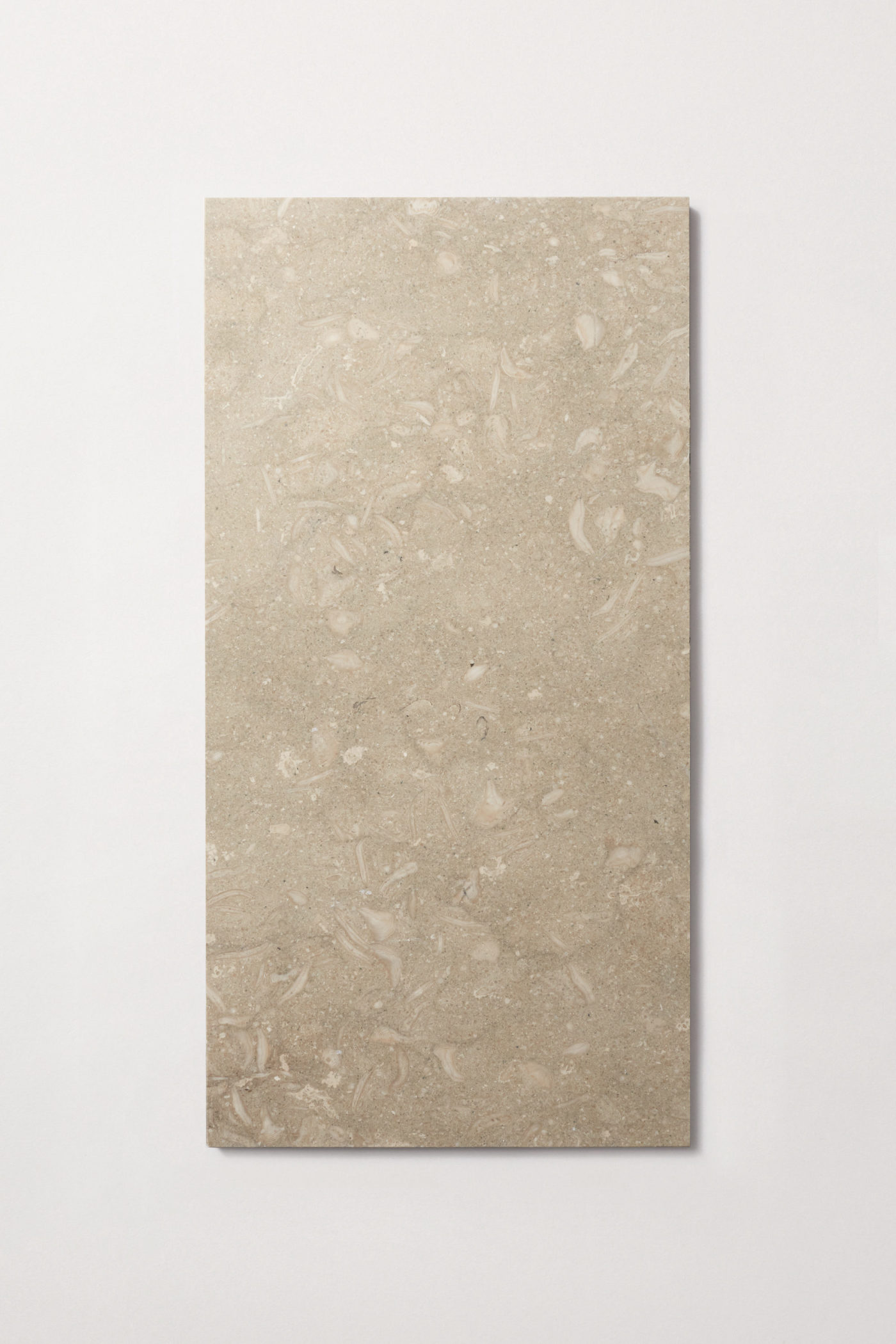 with a smooth, soft, fine-grained look, each stone is utterly unique, bringing with it a quiet tonal moodiness, a bit of shadow and light. arbor is a heavily fossilized grey beige with prominent cream markings and the slightest hint of green.
