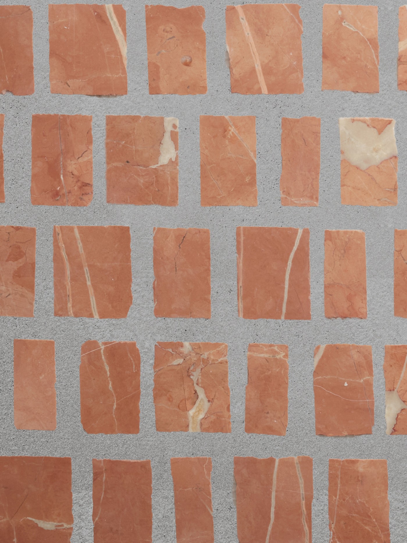 an homage to one of our favorite italian architects and designers, carlo scarpa, these chunks of honed stone and marble with irregular edges are both sophisticated and raw in design. these are offered mounted, accommodating two different grout joint sizes: narrow and wide. with a long tradition of architectural ornamentation, rojo alicante is an earthy, bold rusty-red marble with scattered white and grey veining.