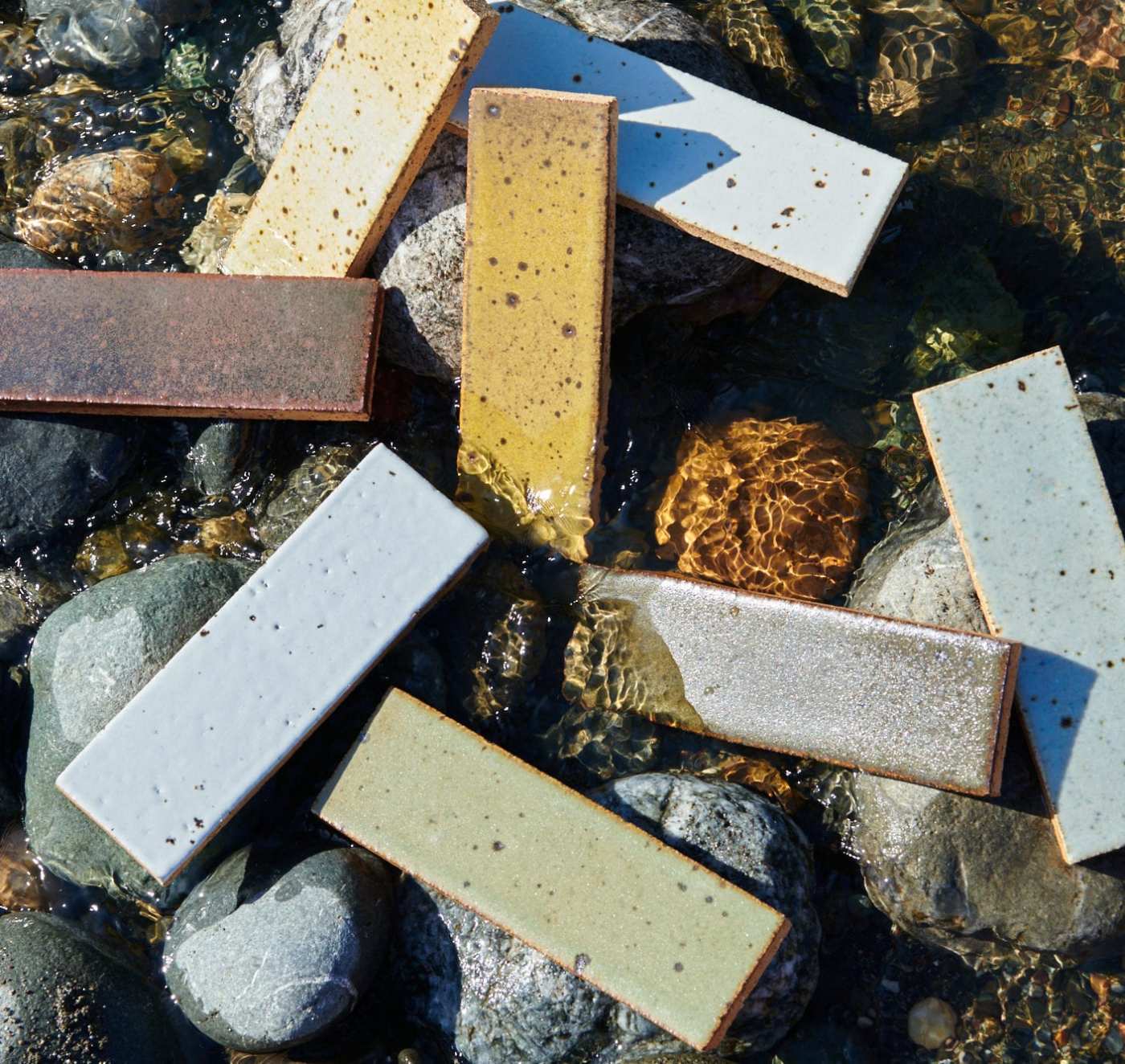 for this line, clé creates custom glazes and uses an unrefined clay sourced from the base of the sierra nevada foothills that allows for the unpredictable nature of raw material interactions when fired in the kiln. the result is a thin glazed brick that embraces all kinds of beautiful re-combinations of the elements creating texture, opacity, surface sheen, pigment variation, inclusions, and crystallization.