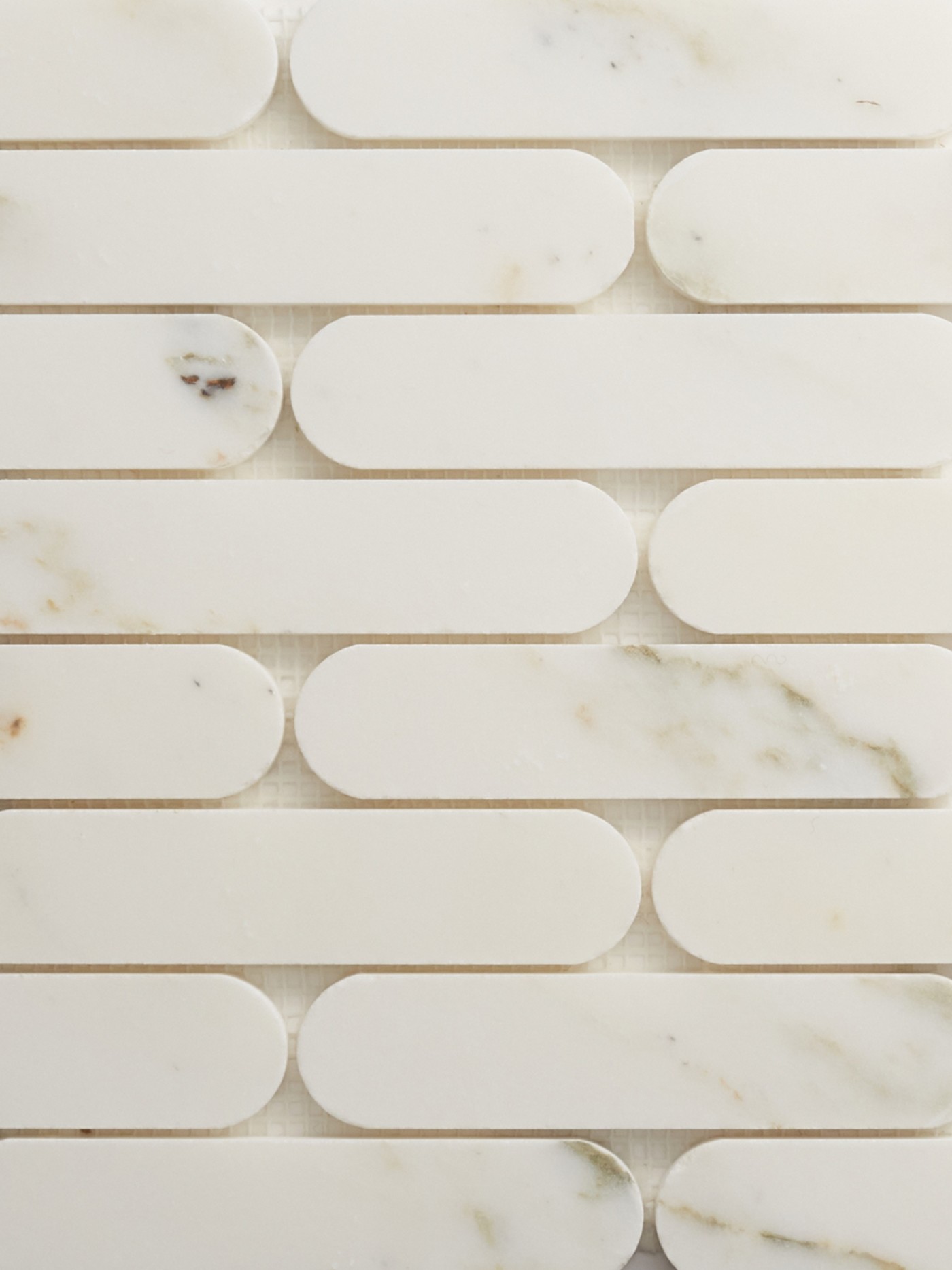 oval petit mosaic sheet - 11¼“ x 12⅜" x ⅜" overall sheet, 1⅜", 6" x ⅜" individual tiles; straight rectified (16 pieces per sheet with a fixed ¹⁄₁₆" grout joint)