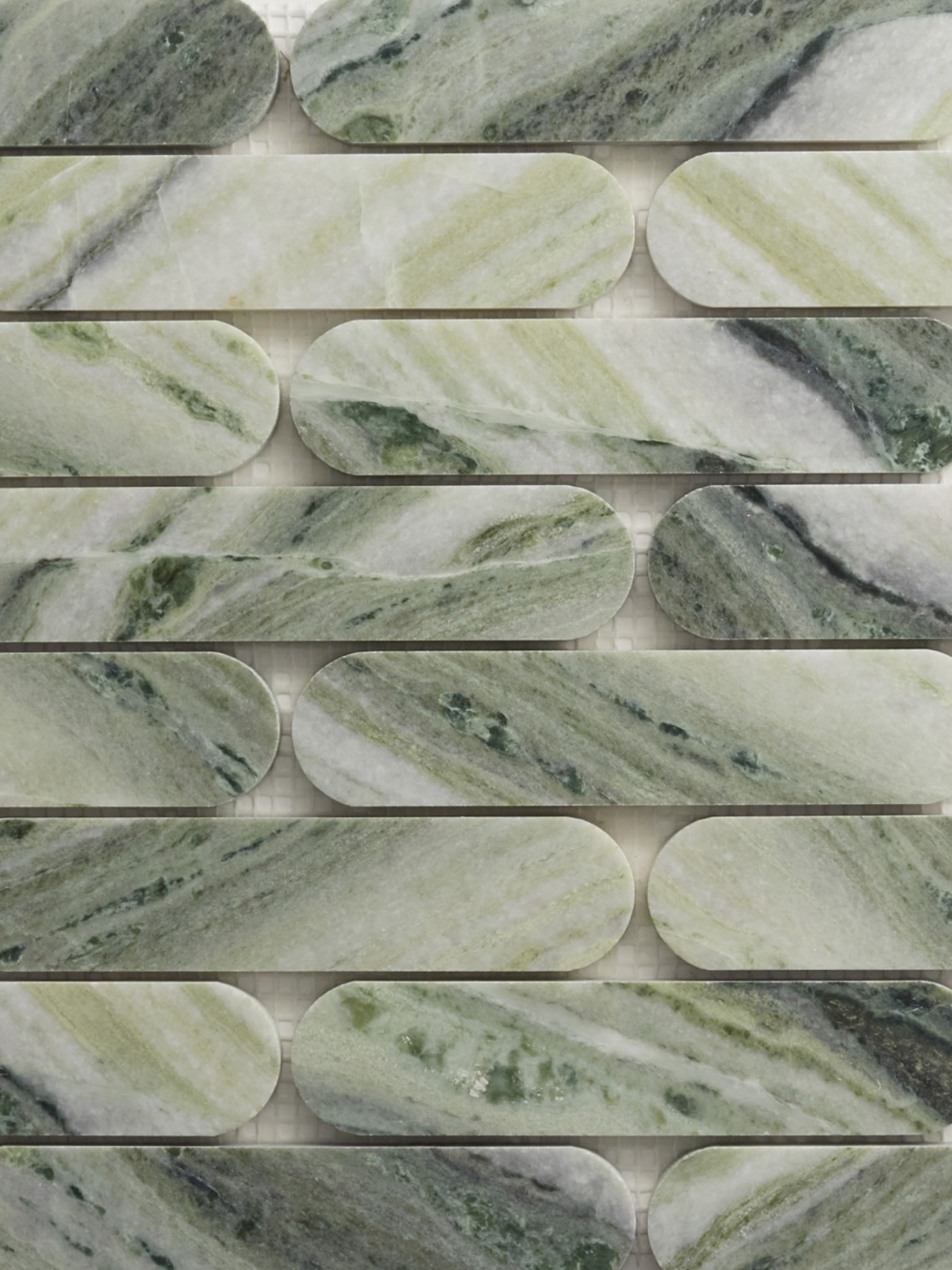 lapidary’s smooth-cut ovals are small stone and marble mosaics in a pill shape that create a grand mosaic for a refined, elegant surface for both floors and walls. the petit ovals come on mounted sheets. an elevated green marble, jade green features a sophisticated blend of dark and light green tones with grey and white veining for projects looking for a unique turn.