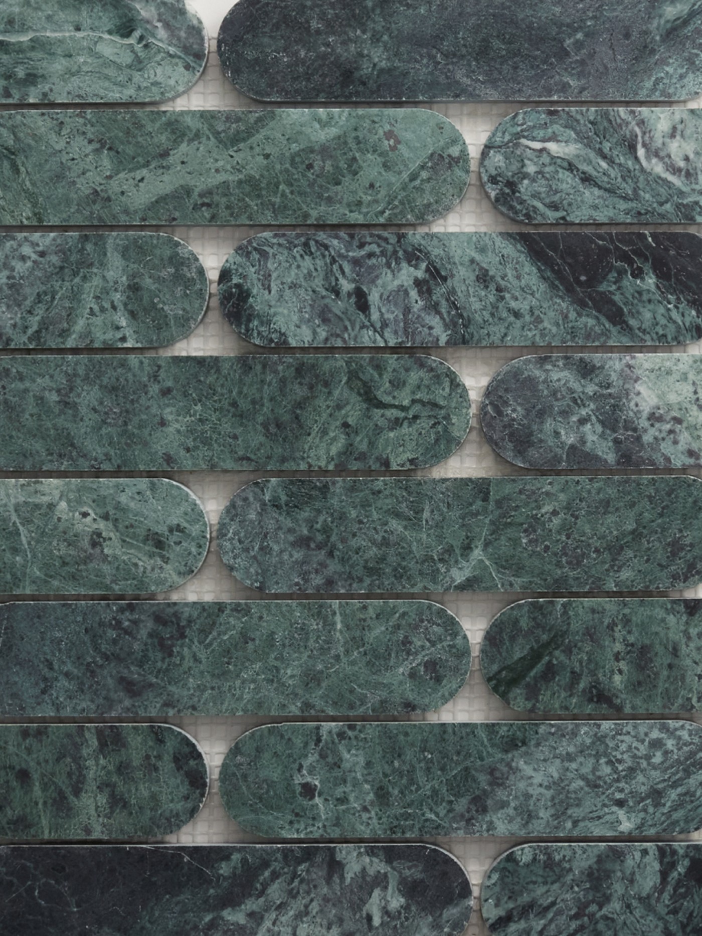 lapidary’s smooth-cut ovals are small stone and marble mosaics in a pill shape that create a grand mosaic for a refined, elegant surface for both floors and walls. the petit ovals come on mounted sheets. verde is a medium green marble featuring veining that ranges from dark green to (almost) white veining.
