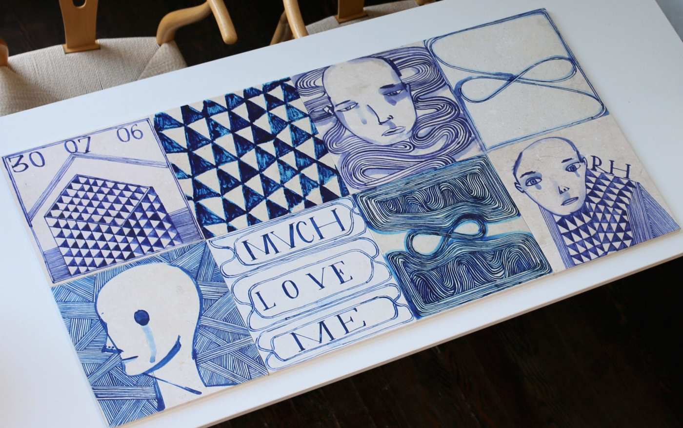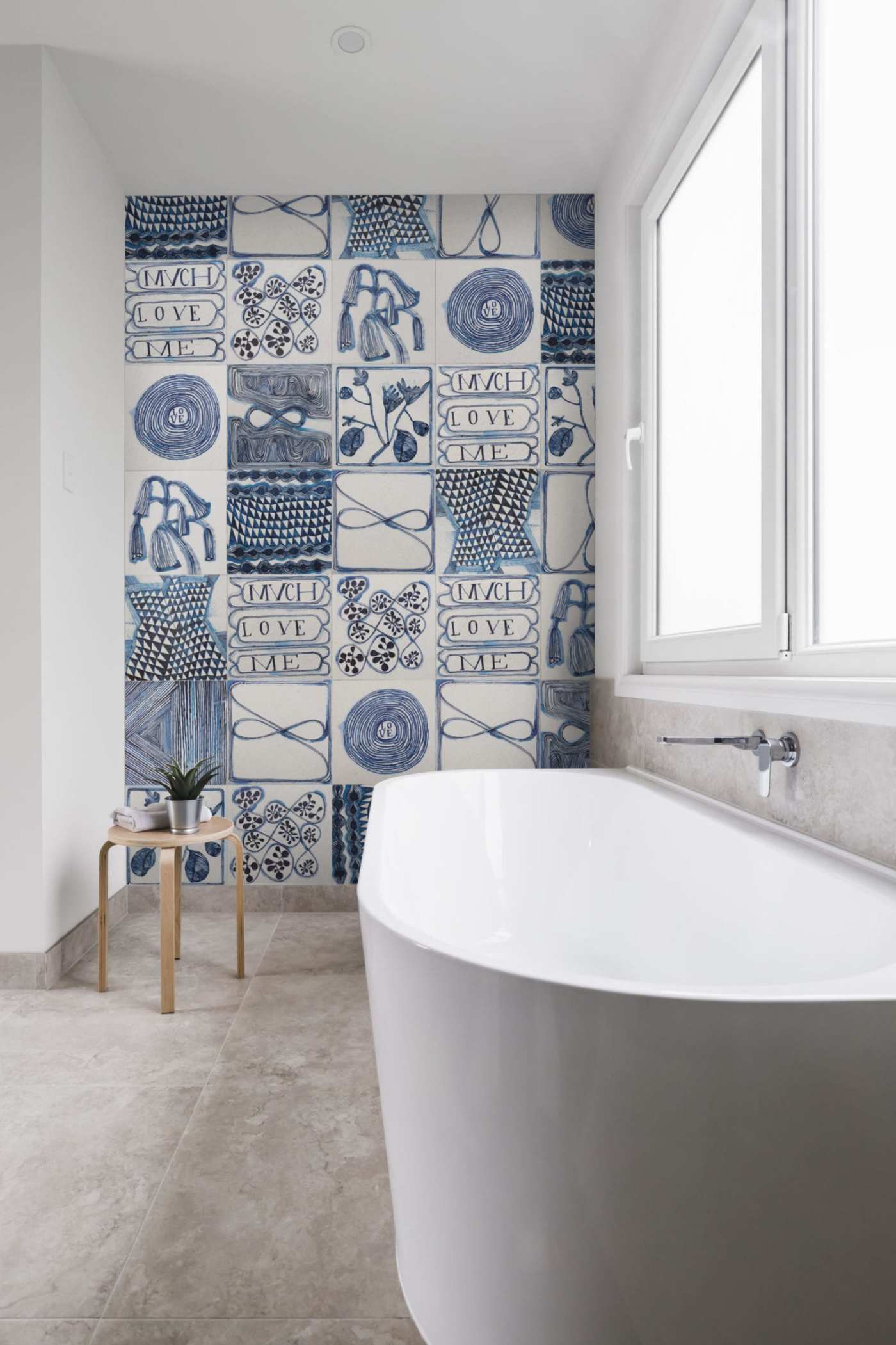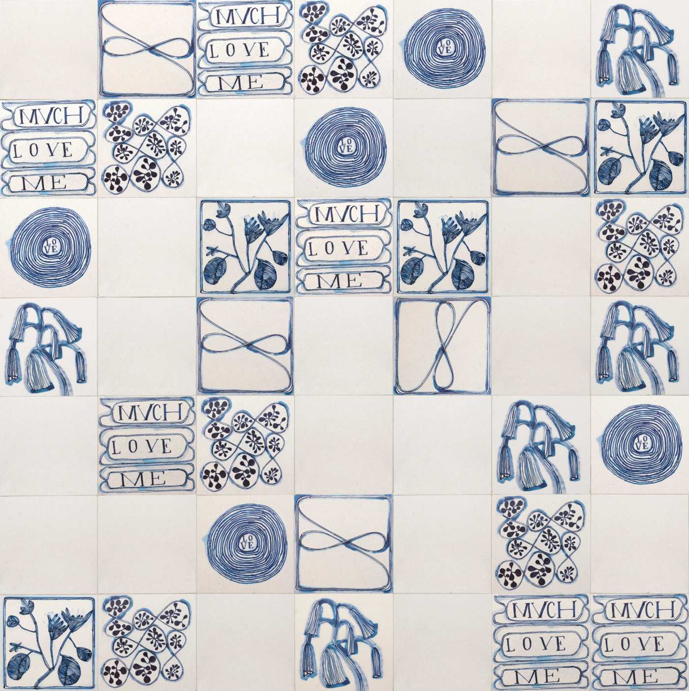 south african artist ruan hoffmann’s hand-drawn patterns, irregular forms and whimsical designs are featured in delft blue in this collection of 12x12 honed limestone tiles, allowing every installation of 'much love me' to have the breadth and depth of an art installation. ideal as a visual backdrop for bathrooms, fireplaces or kitchens, it also makes an arresting feature wall. the collection is available with a field tile, if desired, and can be used in any combination with the ‘much love me’ tiles allowing for greater play of pattern and design.