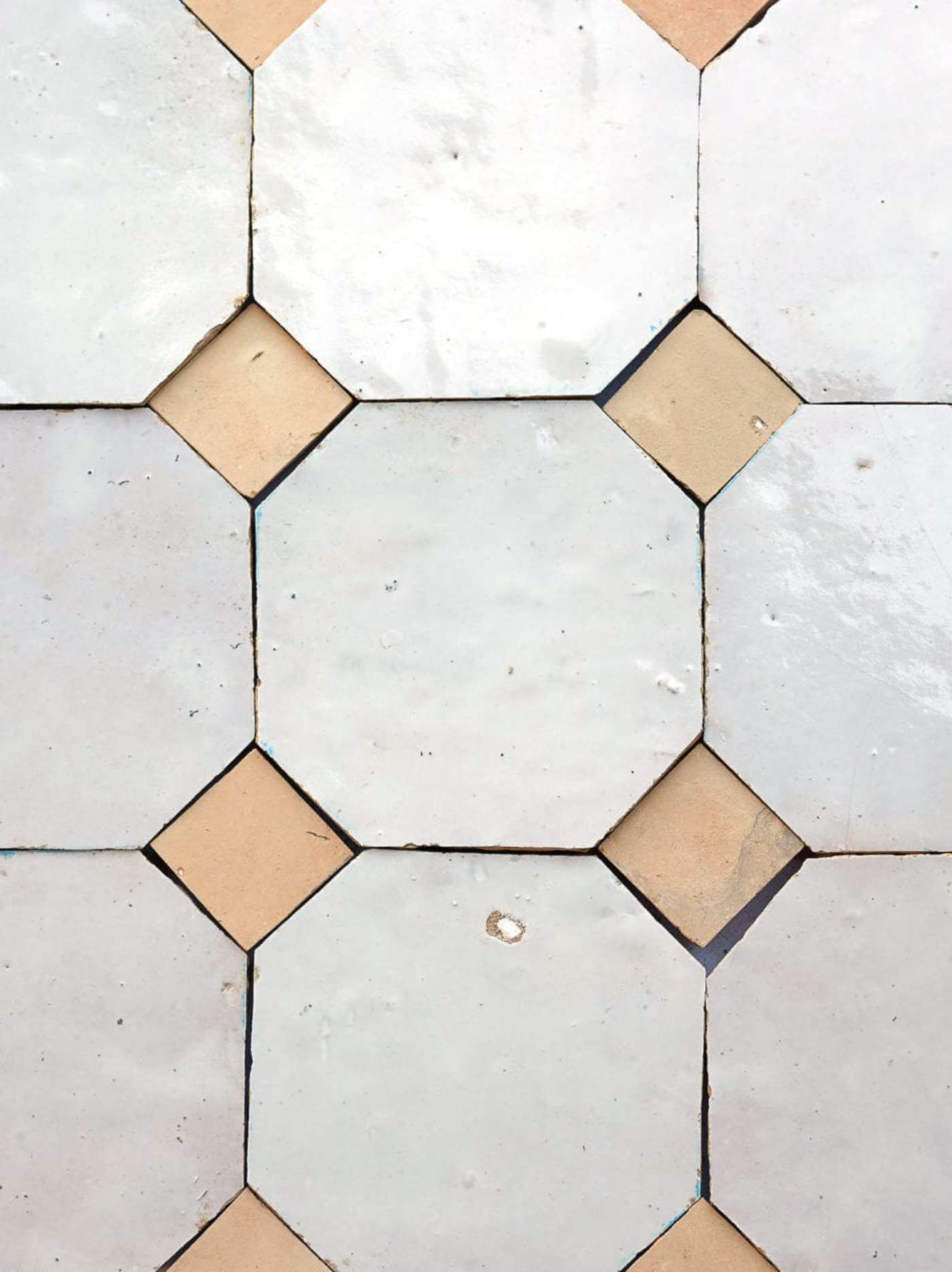 over time, a natural patina will occur on floors as they are maintained and naturally wear. this inherent traffic pattern is a highlight of using zellige and should be both anticipated and favored.